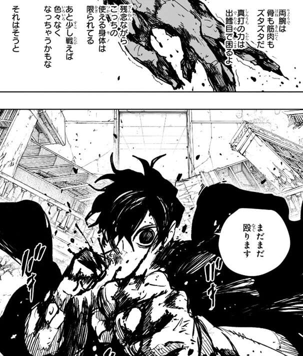 薊の両腕は骨も筋肉もボロボロで、こっちの使える身体(モノ)は限られているので、あと少し戦えば色々なくなっちゃうかもな、と薊は考えつつ、それでも薊は拳を構えて、まだまだ殴ります、とつぶやきます。