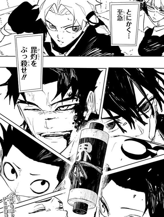 それを聞いた亥猿は、引き続き……毘灼を殺せ!!邪魔する奴がいればそいつも毘灼側の人間だ、とにかく…支給毘灼をぶっ殺せ!!と、本部にアナウンスします。ここで幽を除く毘灼の五人が描かれますが、誰が“受け皿”でしょうか?