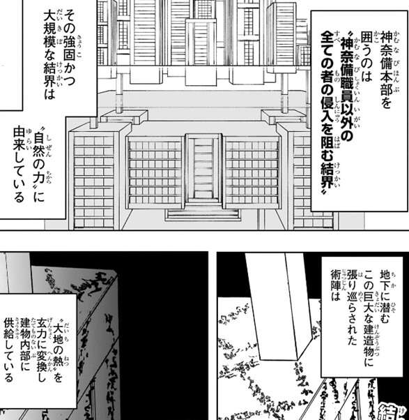 神奈備本部は“神奈備職員以外の全ての者の侵入を阻む結界”に囲まれていて、その強固かつ大規模な結界は“自然の力”に由来しているそうです。地下にある神奈備本部に張り巡らされた術陣は“大地の熱”を玄力に変換して建物内部に供給しているそうです。しかし、玄力は生命エネルギーで人に属し人の意思を介して妖術として成立するので、自然の力に由来する玄力は本来人の手に負えるものではなく、行き場を失った玄力は自然消滅してしまうそうです。