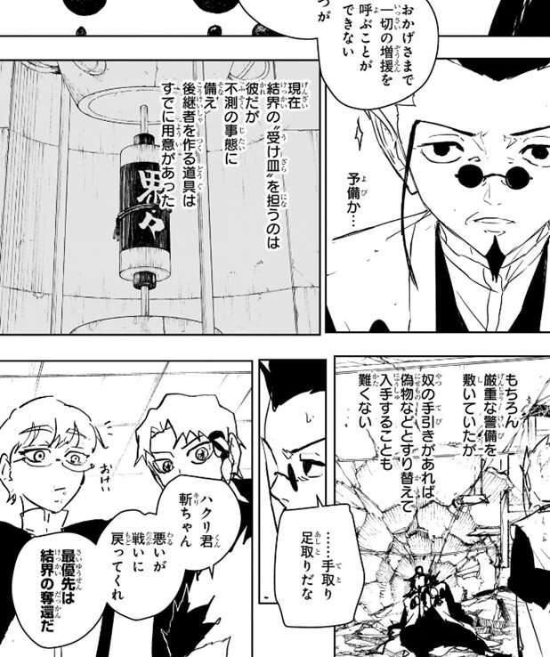 それを聞いた亥猿はこの建物内に“受け皿”がもう一人いる、とアナウンスします。おそらくその“受け皿”が結界の条件を上書きし、おかげで一切の増援を呼ぶことができない、と亥猿がアナウンスすると、壱鬼は不測の事態に備え後継者を作る道具の予備が既に用意してあったことを思い出します。予備の道具にはもちろん厳重な警備が敷かれていたようですが、神奈備長官の嘉仙が裏切り者で、嘉仙が手引きすれば偽物などとすり替えて入手ることも難くないと壱鬼は考えると、ハクリと斬に最優先は結界の奪還で戦いに戻るようにお願いします。