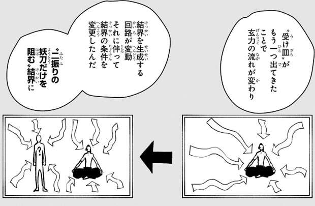 “受け皿”がもう一つ出てきた事で玄力の流れが変わり、結界の条件が変更され“二振りの妖刀だけを阻む”結界になったようです。しかし、荒療治で受け皿が二つある事で力は乱れ不安定になり、その影響は本部とその周辺の電波にさえ影響が出ていますが、それも毘灼の狙いのようです。