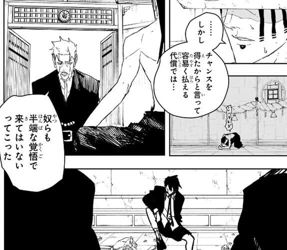 結界の要である妖術師は、チャンスを得たからと言って容易く払える代償では…、と言いますが、毘灼も半端な覚悟で来てはいないってこった、と亥猿は答えます。一方、神奈備の上層部隊に追い詰められているように見える若い男性の毘灼構成員ですが、諦めていないようで、……俺たちは幽を王にする、とつぶやきます。