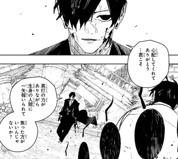 場面は薊と幽の戦いに戻り、そんな戦い方ではすぐに力尽きるぞ、と幽は薊に忠告しますが、薊は、君こそ真打の力がありながら生身の人間に一矢報いられて焦った方がいいんじゃないか?と、両腕がボロボロながら幽に言い返します。幽は真打の力を少しずつ掴めてきたようで、これからは期待に沿うよ、と答えます。