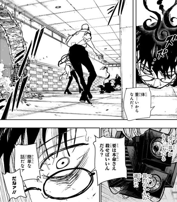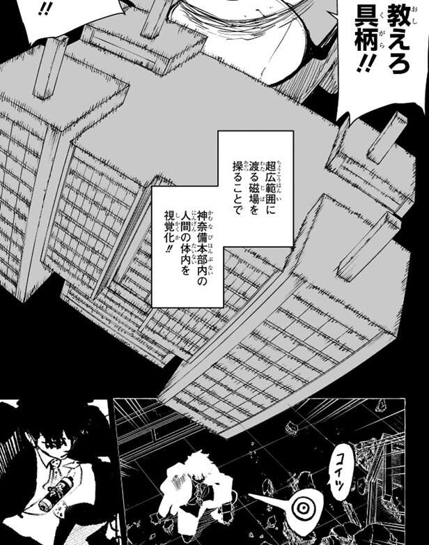 戦闘の場面に戻りますが、両足を失っている荻原はすぐに倒れてしまいます。さらに食事もろくに取ってこなかった荻原は体が重く調子も悪いですが、“受け皿”がもう一人いるという言葉を思い出し、要は本命さえ殺せばいいんだろ?簡単な話だなァ、と言うと、自分の妖術を磁気共鳴画像診断、人体に強力な磁場をかけ体内の磁気的性質を利用し内部の情報を視覚化する技術のように使い、神奈備本部内の人間の体内を視覚化します。