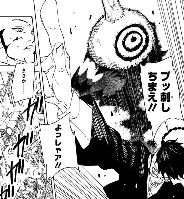 荻原は毘灼の若い男をブッ刺すように叫び、荻原の面は天井を突き破り毘灼の若い男のいる場所へと強襲します。