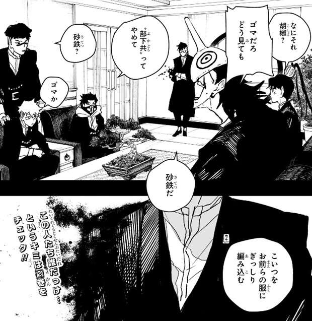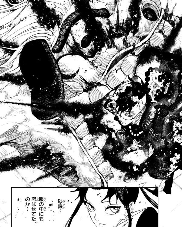 第2巻で双城から刳雲を回収するべく登場した対刳雲特選部隊が久々の登場ですが、隊長の萩原 幾兎が部下達に自分の妖術・磁戒の砂鉄を服にぎっしりと編み込む事を提案しています。