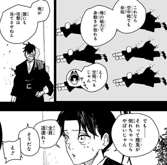 萩原の磁戒の砂鉄を編み込めば、空中戦でも余裕で萩原の磁力で身動きが取れるそうです。萩原は部下達の誰にも攻撃は当てさせないと自信を持って言いますが、張間 梓弓は荻原が先に倒れたらやばい、全員道連れ?と懸念します。しかし荻原は、俺より先に死ぬことはねえってことだ、と言い、対刳雲特選部隊の命を預かると言います。しかし、結果は四人が殉職し、一人は右腕を失い、荻原も一命は取り留めますが両足を失って戦闘不能になってしまいます。