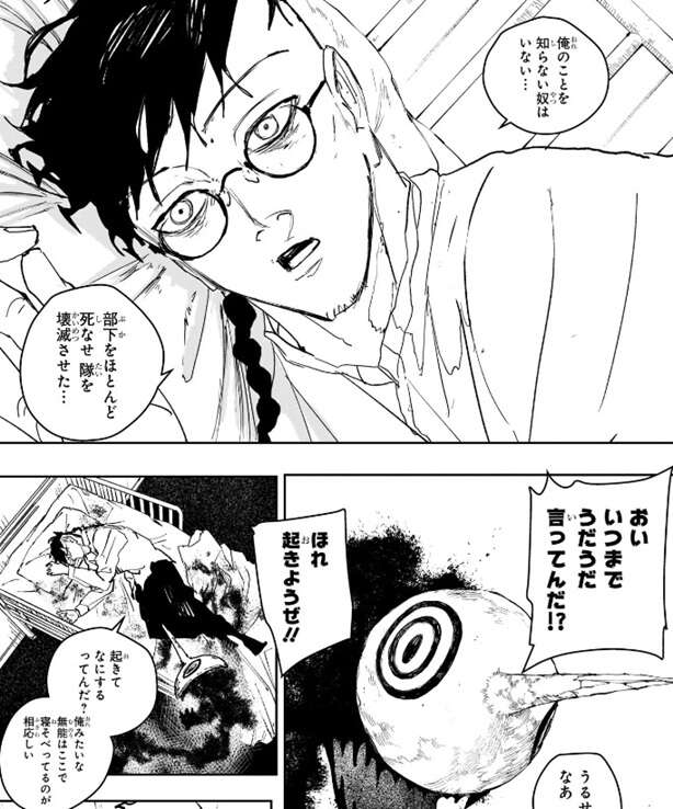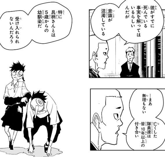 具柄が既に死んでいる事実は理解しているようですが、意識が混濁していてこのような状態になってしまっているようです。荻原の世話をしている神奈備職員は、無理もない、亡くした隊員は皆10年以上の付き合いで、特に具柄とは5歳からの幼馴染だから受け入れられないんだろう、と誰も荻原を責めません。荻原の周りにあるのは部下達が衣服に編み込んでいた砂鉄で、囲まれていると皆といるみたいで安心する、と荻原は言っているようです。神奈備職員は、なかなか優秀だったが、しばらくは戦えないだろうな、と言いますが、荻原本人は食欲もわかずあれから全然食べていないようで、具柄の面に、死んじまうぞ~、と言われますが、……構わねえよ、と答えます。