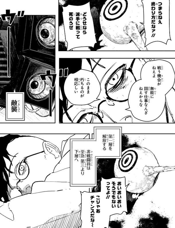 具柄の面に、どうせなら派手に戦って死のうぜ、と言われますが、荻原は、戦う機会がねえよ、無能に回す仕事なんざねえからな、このまま朽ちるのが相応しい、と投げやりな状態です。そこに毘灼による神奈備本部の敵襲が発生、第一層が解放され、非戦闘員は至急 第三層より下層へ移動するように指示が出ます。それを聞き具柄の面は、こりゃあチャンスだな~、と喜びます。さらに前回、第97話で毘灼の中に結界の要となる“受け皿”がもう一人いる事が判明、真打の力が大きすぎて視界が乱れてしまい誰かは特定できない状況で、とにかく至急毘灼を殺すように亥猿から指令が出ます。