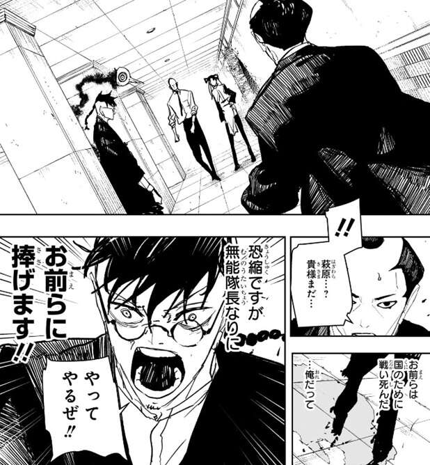 今度は第93話の場面に移り、右嵐と瓶伍が神奈備の上層部隊と対峙する場面の続きとなりますが、そこに荻原が乱入してきます。荻原は部下達は国のために戦い死んだので、自分も無能隊長なりに戦って命をお前らに捧げようとします。