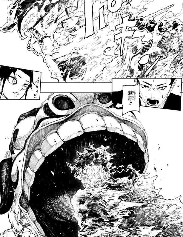 しかし、荻原は砂鉄を服の中に忍ばせておいたようで、右嵐と瓶伍の妖術を砂鉄で防ぎ、凍らされ獅子舞に食われるのを阻止していました。ここで医者による荻原の状態に関する説明が入りますが、荻原は双城との戦いで岩を下半身に水中で押しつぶされて死にかけますが、意識が薄れる中で人の影を見た、具柄が陸に引き上げてくれた、と医者に証言したそうです。しかし医者に言わせると、状況から荻原を陸に上げたのは彼自身の力で、彼は精神を病み思いがけず具柄を作り出してしまったそうです。
