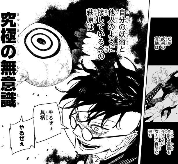 そんな荻原を見て大衆は“荻原はもう終わりだ”と言うかもしれないが、妖術の神髄は余計な意識を介さない玄力の自然な巡りで、自分の妖術と他人のように接している今の荻原は究極の無意識で、医者は今の荻原ほど戦闘に適している者はいないよ、と今の荻原の状態を説明します。