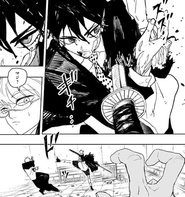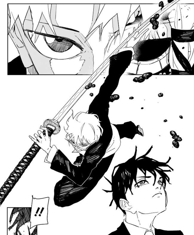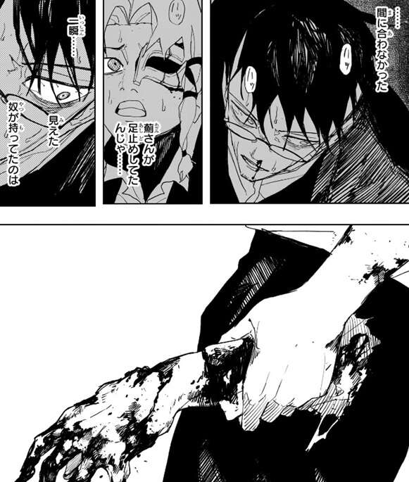しかしもう一人の“受け皿”の両腕は瞬時に再生し、さらに刃が入った体の方の傷もすぐに再生して、それ以上刃が通りません。あまりの再生速度に斬も、マジ?と、驚きます。そこにハクリが蔵の能力で刀を出し、威葬でその刀を飛ばしもう一人の“受け皿”をさらに攻撃しようとします。