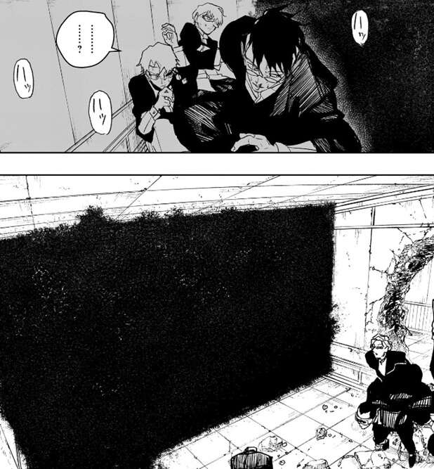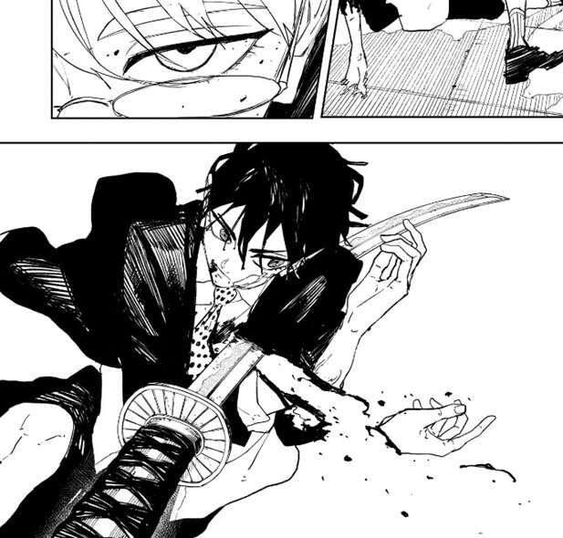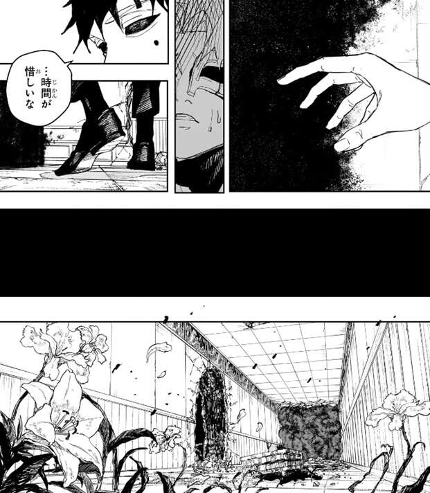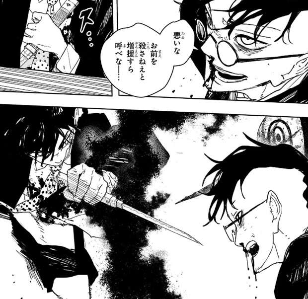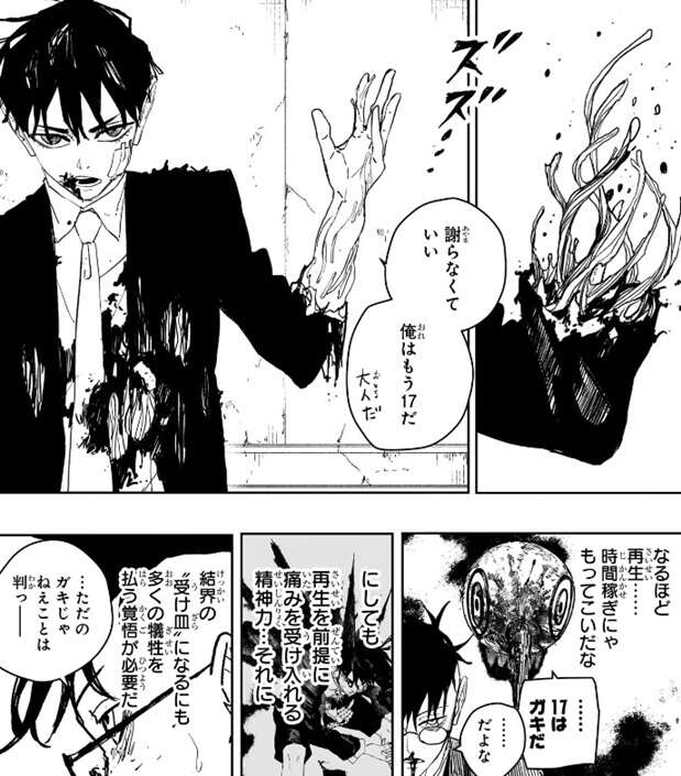 荻原は砂鉄で小刀を持っていた方の腕を跳ね飛ばしますが、もう一人の“受け皿”はすぐに腕を再生します。荻原が、ガキ、と言ったのを気にしたのか、もう一人の“受け皿”は、謝らなくていい、俺はもう17だ、大人だ、とわざわざ反論しますが、荻原と具柄は、……・17はガキだ、とさらに反論します。そんな反論をしつつも、荻原がもう一人の“受け皿”の再生速度や痛みを受け入れる精神力に驚いていると、荻原はまたも倒れてしまいます。ろくに飯も食っていないのに飛ばし過ぎたのが災いして、動けなくなってしまい、味方に早く奴の首を刎ねるように叫びます。
