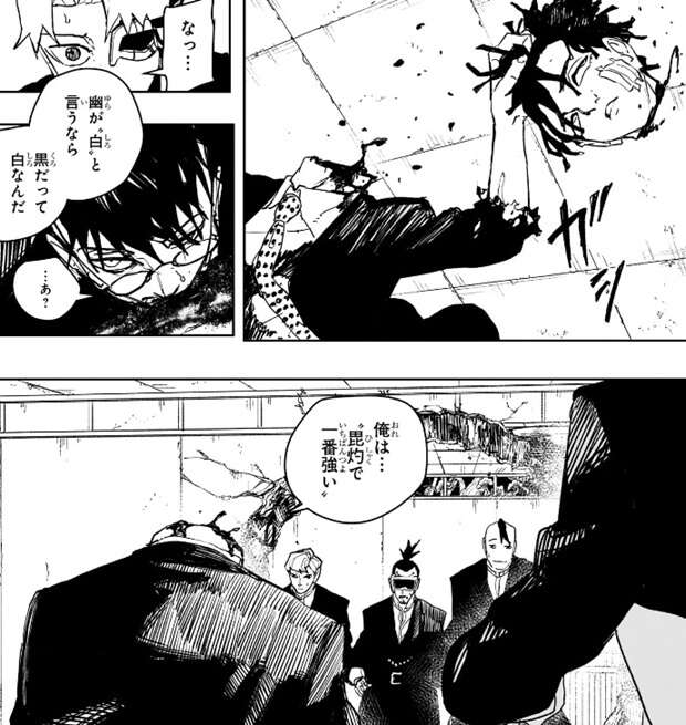 この攻撃は避けられますが、もう一人の“受け皿”の背後に移動していた斬がハクリが飛ばした刀を受け取ると、首を跳ね飛ばします。しかし、もう一人の“受け皿”は首を跳ね飛ばされてもさらに動け、自分の首を手で掴むと、幽が“白”というなら黒だって白なんだ、俺は…“毘灼で一番強い”と首を跳ね飛ばされても普通に喋ります。