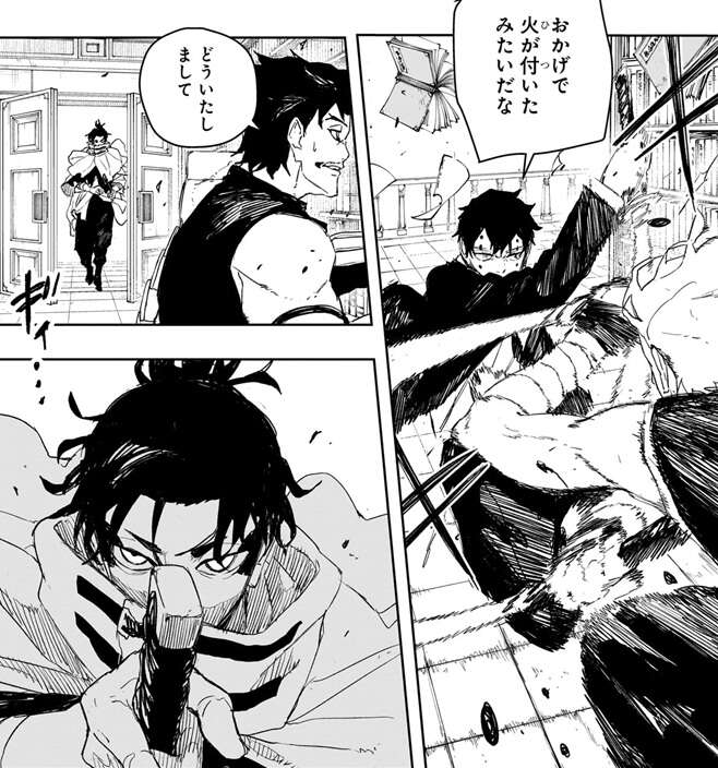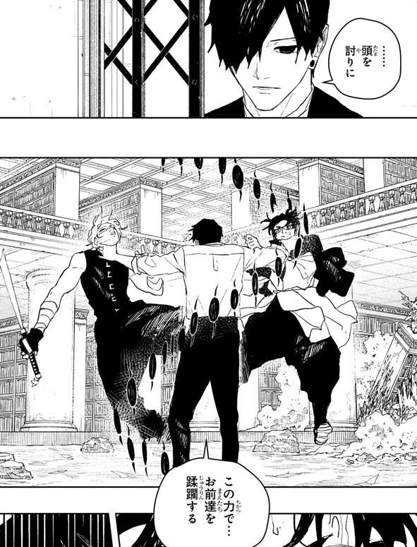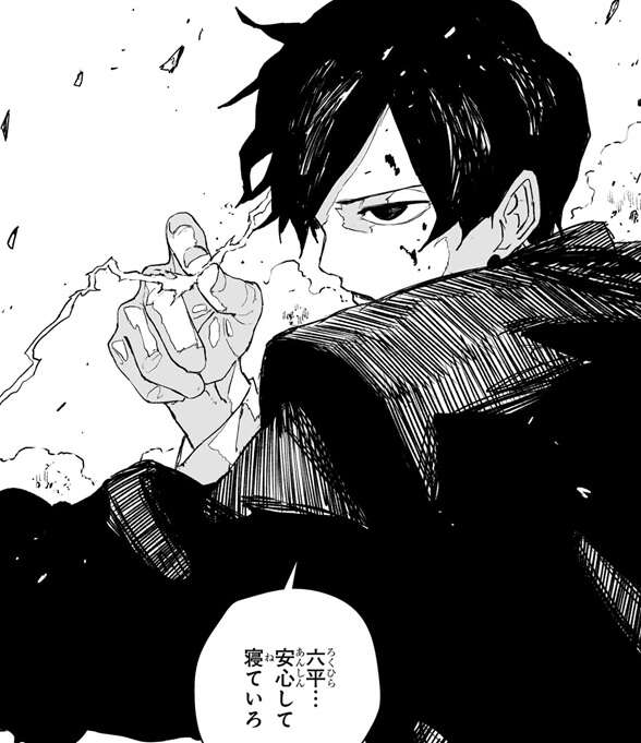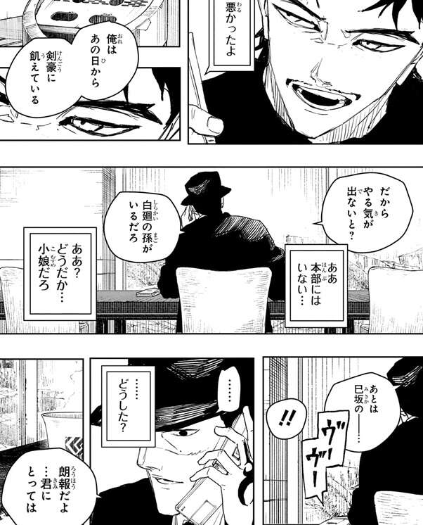 毘灼構成員の五名に第五層の西側まで侵入されてしまい、本部の亥猿は各上層部隊に毘灼を包囲し、“毘灼(しんにゅうしゃ)は皆殺し”だ、と指示を出します。一方、幽を始め毘灼構成員の五名と裏切り者の二名に囲まれた漆羽とハクリですが、そこに亥猿隊の白廻斬が現れ、天井ごと裏切り者の一人を斬り殺します。白廻斬は漆羽や座村の師で居合白禊流の開祖である白廻逸夫の孫で、漆羽や座村は昔よく斬のお世話をしてご機嫌を取っていました。漆羽や斬は毘灼の前でも軽い雰囲気で会話を交わし、毘灼構成員はたまらず漆羽を背後から攻撃します。