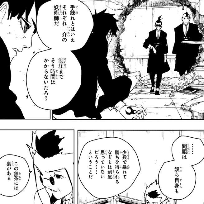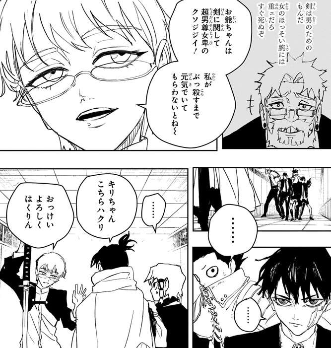 奈ツ基、漆羽、幽、北兜の四つ巴戦は四人とも深い傷を負いますが、戦いが終わることはなく奈ツ基や北兜を中心に少し会話をした後、さらに戦いは続行されます。一方、斬とハクリは壱鬼と薊と合流、ハクリは壱鬼から真打に何か細工がされているかもと懸念を聞かされます。