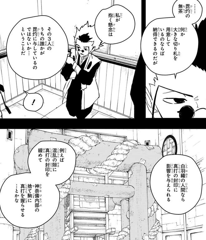 壱鬼は真打が封印された部屋に向かう道中、真打の封印に抱く懸念として真打の封印をした神奈備上層部の3人の中に裏切り者がいるかもしれないという話をします。そして、真打が封印された部屋に到着し、壱鬼は真打の封印が健在で問題ない事に安堵しますが、長官の嘉仙は壱鬼に対して不穏な反応を見せます。
