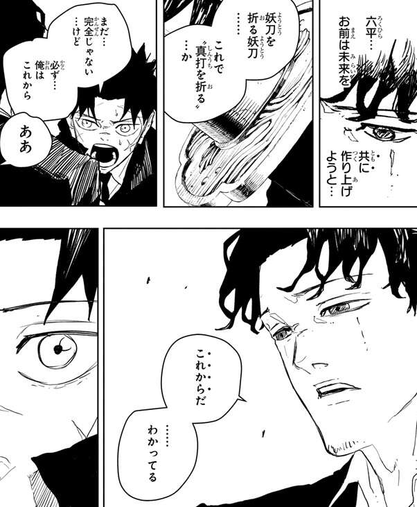 チヒロが示した覚悟と、痛くても全部踏みしめて未来に進むと言う言葉が座村をついに根負けさせて、座村はチヒロと和解します。さらに座村は自分の眼を治し、娘のイヲリと涙の再会を果たします。チヒロは飛宗で俺がこれから負う傷を癒して欲しい、と共闘を申し出て座村もそれに応じます。