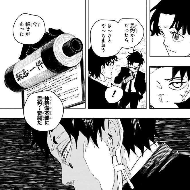 神奈備本部では毘灼メンバーが猛攻を仕掛けますが、漆羽や斬、奈ツ基、薊、さらに上層部隊が毘灼を包囲、対応していきます。しかし、奈ツ基、漆羽、幽、北兜の四つ巴戦の中で、幽は奥の手である真打の力を使用し、一気に神奈備本部を蹂躙しようとします。毘灼と通じていた裏切り者の嘉仙は、薊に一撃で沈められますが、幽は真打の力に蝕まれながらも神奈備本部を蹂躙しようとします。そして、薊も幽の元に到着し、幽と薊、漆羽、奈ツ基の死闘が始まろうとします。