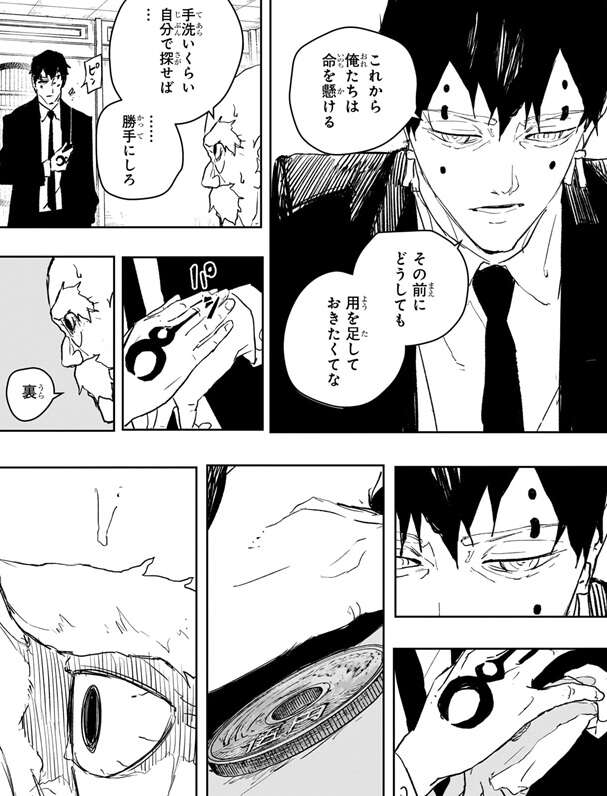毘灼について神奈備が分かっている事は、十名の妖術師によって構成される小組織、幽という男が率いている、目的は剣聖の殺害と真打の使用、戸籍に無い血、有力な家系に属さない妖術、ばらついた年齢層、六平国重暗殺を成し遂げる実力、などほとんどが未だ濃い霧に包まれている亡霊のような組織でした。その毘灼構成員の五名が第一層の曲者処刑場前で集結しており、なぜか曲者処刑場には入場せずにくつろいでいました。さらに幽は老人の神奈備職員にどうしても用を足したいので、コイントスで勝ったらトイレの場所を教えてくれと奇妙な賭けを提案します。老人の神奈備職員は拒否しますが、あんたが勝てば俺の命をやると言い、幽はトイレの為に命を賭けるという不可解な行動を取り、老人の神奈備職員は戸惑いを覚えます。