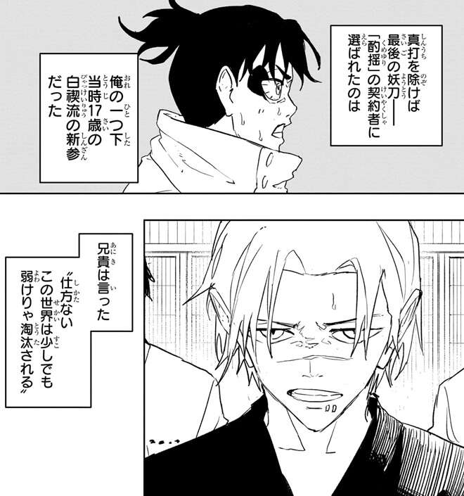 一方、猛攻を受けている神奈備本部で毘灼の奇襲の放送に気付かず、剣術の訓練をしている男がいました。男は3年前に北兜に殺された巳坂伊武基の弟、巳坂奈ツ基で、奈ツ基は妖刀の契約者を目指していましたが「酌揺」の契約者に選ばれたのは漆羽でした。奈ツ基は自分より一つ下の漆羽が選ばれた事を悔しがりますが、同時に弱かったから仕方ないと自分を戒め、その後の18年間1日も剣術から目を離さず鍛錬を重ねていました。