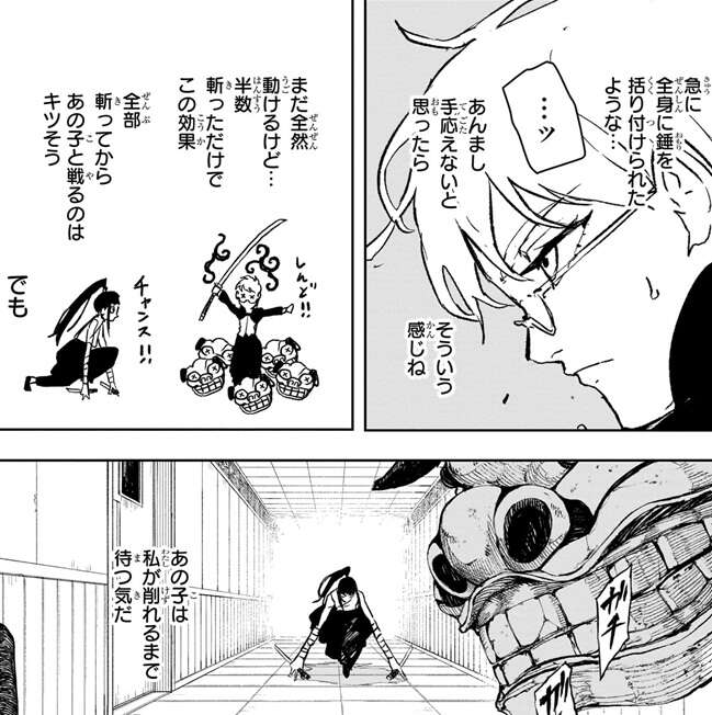 斬はハクリを守るため裏切り者の女と対峙しますが、裏切り者の女からは、毘灼の手下じゃない、18年前から毘灼と同じ考えなだけ、と言われます。斬は五尺大太刀の“鬼池華(おにちか)”を操って、襲ってくる魔咬で生み出された獅子舞のような化け物を次々と斬り殺していきます。しかし暫くすると斬と漆羽は急に体が重くなり、これは魔咬で生み出された獅子舞のような化け物を斬った罰則で、化け物を斬ると体が重くなる効果がこの妖術・魔咬にはあったようです。