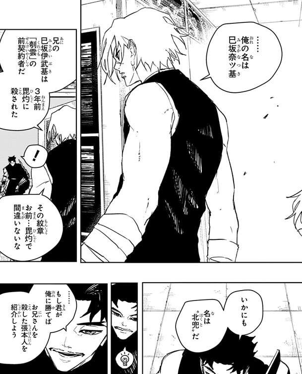 斬は裏切り者の女を鬼池華で串刺しにして倒しましたが、そこに北兜が襲撃してきます。北兜は斬の首を捕まえて、ハクリの威葬も一歩も動かず衝撃を弾き返します。北兜は漆羽の居場所を問い詰めますが斬に答える気はなく、北兜は斬を斬ろうとしますがそこに奈ツ基が参戦、斬を助けた後、自分は巳坂奈ツ基で兄の巳坂伊武基は「刳雲」の前契約者だと名乗ります。