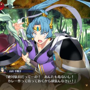 結構、ダウンさせられて手におえないので香姫の「おだんごどうぞ」で毒攻撃に頼ります。あと、キムチの「キムチ鍋」が地味に助かります。後、弱点属性が雷なので志津香を「Lv43 志津香」に変えています。