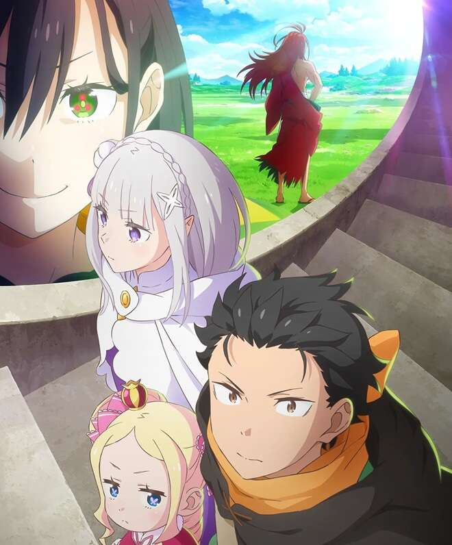 4期のキービジュアル第一弾が公開されています。賢者の住まう「プレアデス監視塔」と思われる塔の階段を上っている、スバル達が描かれています。あわせてキービジュアルには新キャラクターの『賢者』シャウラと、『初代剣聖』レイド・アストレアも描かれています。