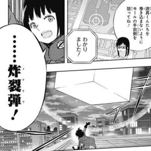 さらに絵馬は三雲を攻撃し、三雲は片足を失い大ダメージを受け、トリオン漏出甚大の警告がなります。来馬と三雲への攻撃がとおった絵馬ですが、潜んでいた東隊の小荒井と奥寺が絵馬を攻撃にいきます。再装填も間に合いそうになく絶体絶命の状況です。