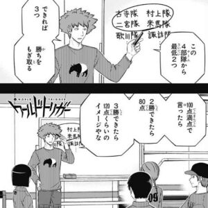 そして、生駒の駒は王子が使い、王子の駒は帯島が使うという指示を王子は出します。辻はチームの守りの要で、辻の動きは辻にしか出来ないという事で、辻は引き続き自分の駒を使う事になります。このような作戦で王子隊は戦争シミュ3日目だけ変化をつけていて、作戦としては北添隊に近いものになっています。迅から、自動的に裏をかく感じになっているのがおもしろい、と評価されています。
