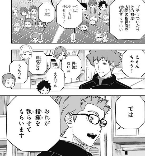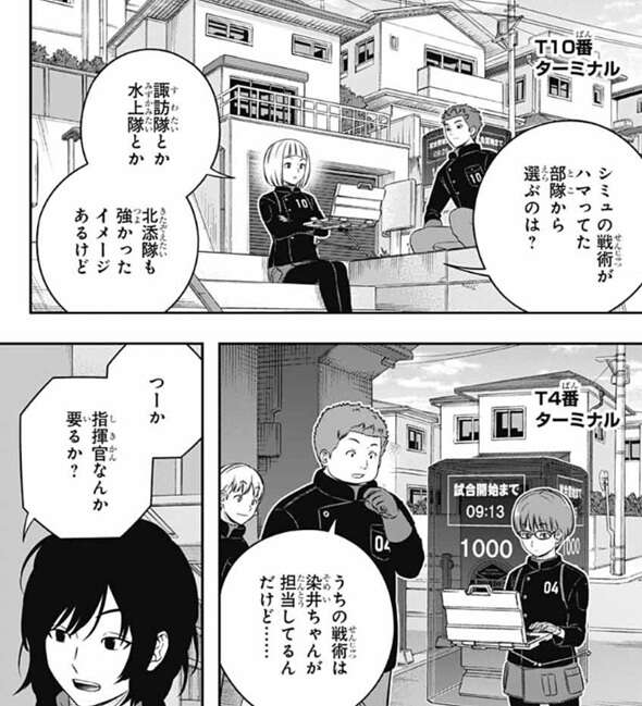 そうしていると来馬から通信が入り、みんな揃ったみたいなので指揮官を決めましょうと連絡が入ります。遠征経験者以外から選ぶので、歌川、菊地原、東、二宮が臨時部隊の中からは指揮官候補から除外されます。氷見はシミュの戦術がハマってた部隊から選ぶことを提案し、諏訪隊や水上隊、北添隊を挙げますが、北添はうちの戦術は染井が担当していたけど並列処理が苦手なようで、全体を見る指揮官は難しいと言います。さらに漆間は指揮官なんて要るか?それぞれ好きに動けばいいのでは?と、意見します。