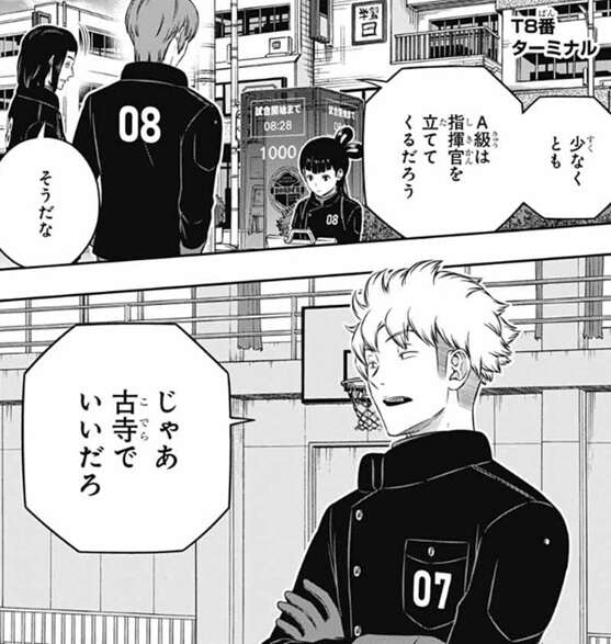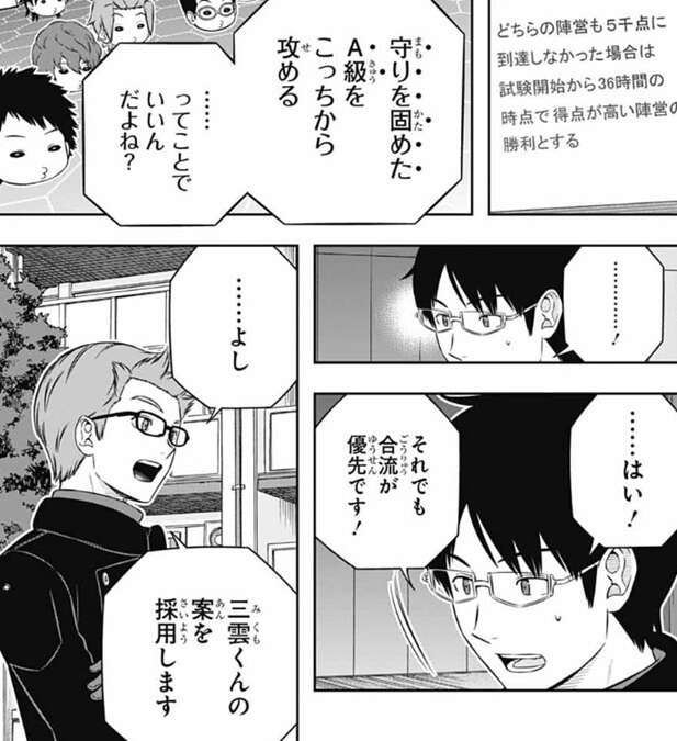 その場合は守りを固めたA級をこっちから攻める、……ってことでいいんだよね?と、王子は三雲に確認しますが、三雲はそれでも合流を優先すると言い、古寺は三雲の案を採用します。2・3・4・5番のターミナルを前線として、他の部隊は試験開始と同時に指示した部隊へ合流するように古寺は全員に指示します。さらに前線の部隊は周囲の警戒と地形の情報を収集するように、合流部隊も道中で追加の情報があれば送るように、古寺は追加で指示し全部隊が古寺の指示に同意します。