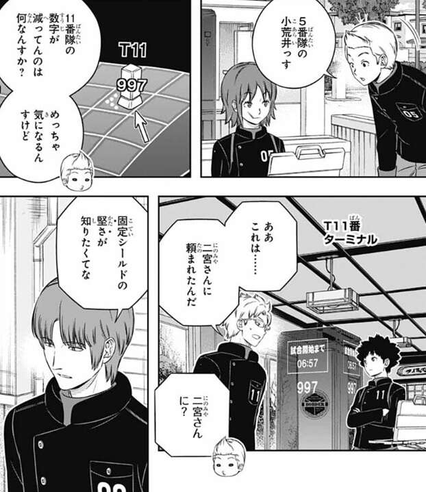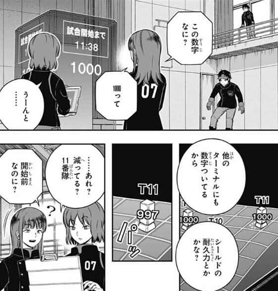 三雲と隠岐が体育館の中に戻ってくると、香取と宇井が試合開始までのカウントダウンをしているオブジェのような物を見ていますが、1000という数字が表示されています。香取と宇井がこの数字がなにか?を話していて、宇井がマップを確認すると他のターミナルにも同じ数字がついているから、シールドの耐久力とかかな?と、宇井が推測していると11番隊のターミナルの数字が試合前なのに997に減ります。