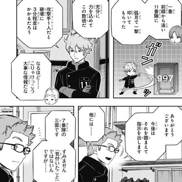 一番前線から遠く、戦闘が始まっても影響が少なそうな11番隊のターミナルに、ヒュースが弧月で一撃叩いたそうです。ヒュースが十分力を込めて3しか減らなかったので、アタッカー1人だと破壊に3分程度はかかりそう、とヒュースは言います。古寺が他に気付いたことがないかみんなに聞くと、三雲が『気付いたこと』ではないが、試験が開始したらすぐに前線に集まりませんか?と、古寺に提案します。