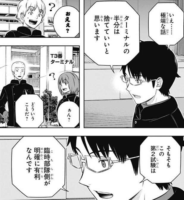 外岡が前線で敵をシャットアウトする感じか?と、三雲の考えを推測しますが、三雲の考えは違っていて、三雲は極論ターミナルの半分は捨てていいと思うと言います。さらに、そもそもこの第2試験は臨時部隊側が明確に有利なんです、と三雲は言うと古寺と水上は三雲の意図が分かっているようで、二人とも声には出しませんが三雲の意見に同意します。