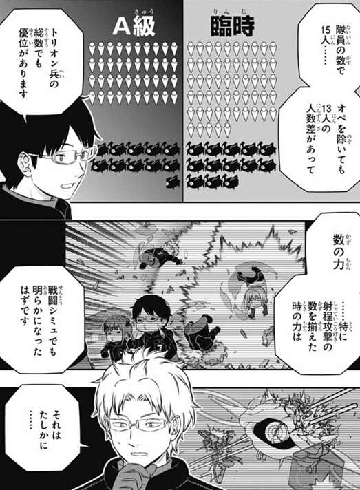 隊員の数で15人、オペを除いても13人の人数差があり、さらにトリオン兵の総数でも臨時部隊には有利がある、と三雲は言います。数の力、……特に射程攻撃の数を揃えた時の力は戦闘シミュでも明らかになったはずです、と三雲が言うと、若村はヒュースの爆撃機(カナダ)が諏訪隊の集中砲火で落とされた時を思い出し、それはたしかに……、と頷きます。漆間も、まあどんな相手でも飽和攻撃すりゃ落ちるからな、と同意しますが、空閑は、迅さんはどうだろな…、と一人考えます。
