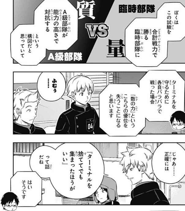 三雲はこの試験を合計戦力で勝る臨時部隊にA級部隊が能力の高さで対抗する、という構図と推測していて、ターミナルを守るためにバラバラで戦うと『数の力』という優位を失うと三雲が言うと、『ターミナルを捨ててでも集った方がいい』って話だね、と犬飼が三雲の考えを代弁します。仮にターミナルを6つ落とされて、3000点失っても戦力差が維持できてるなら勝算はある、と三雲は言い、逆にターミナルが無傷でも戦力が削られて数の有利を失うとかなり厳しくなると三雲は考えを捕捉します。