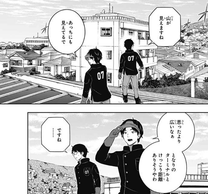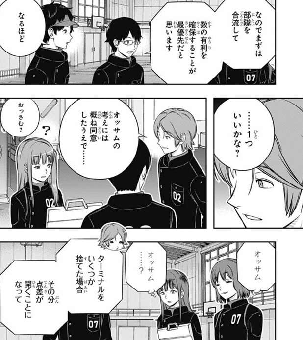 バラバラでいると各個撃破される可能性があると三雲はすぐに前線に集まる理由を話し、少なくとも2チームずつのグループで行動したほうがいい、と三雲は言います。木虎と空閑が賛成しますが、王子は少し黙ってします。すると南沢が、前に集まるのはいいけどさぁ、後ろのターミナルはどうすんの?がら空きになっちゃうじゃん、と後ろのターミナルをどうするのか三雲に聞きます。