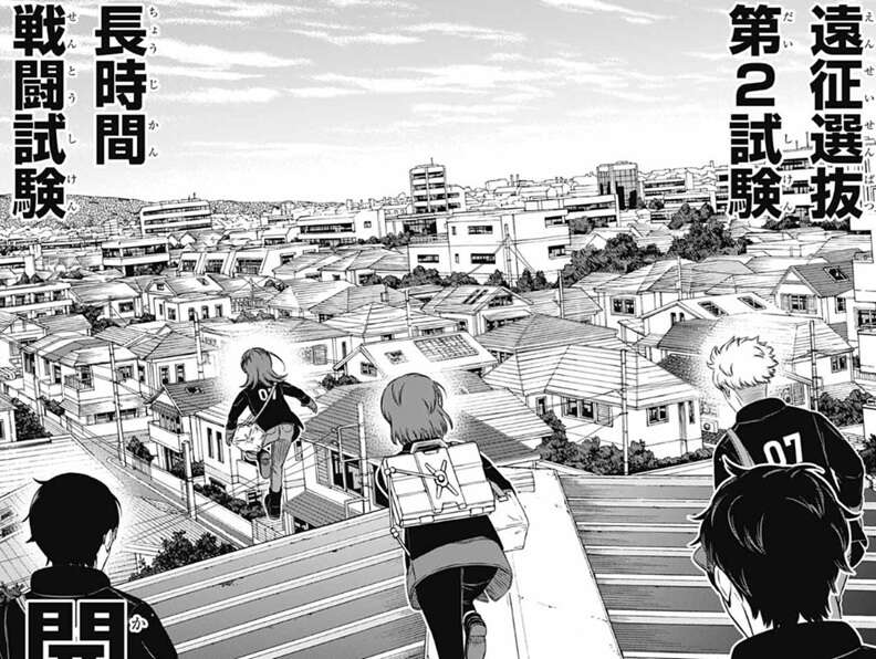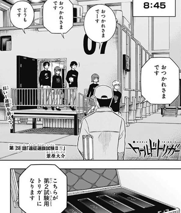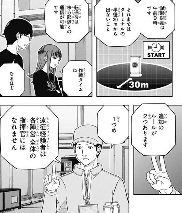 諏訪隊は先頭が香取、宇井を真ん中にして、諏訪が右、三雲が左、隠岐が後ろの陣形で前線のターミナルに向かい前線の部隊との合流を目指します。諏訪は宇井に香取の動きをよく見ろと指示し、香取の動きがトリオン体の操作の手本になると宇井に言います。そして午前9時になり、遠征選抜試験第2試験 長時間戦闘試験が開始されます。