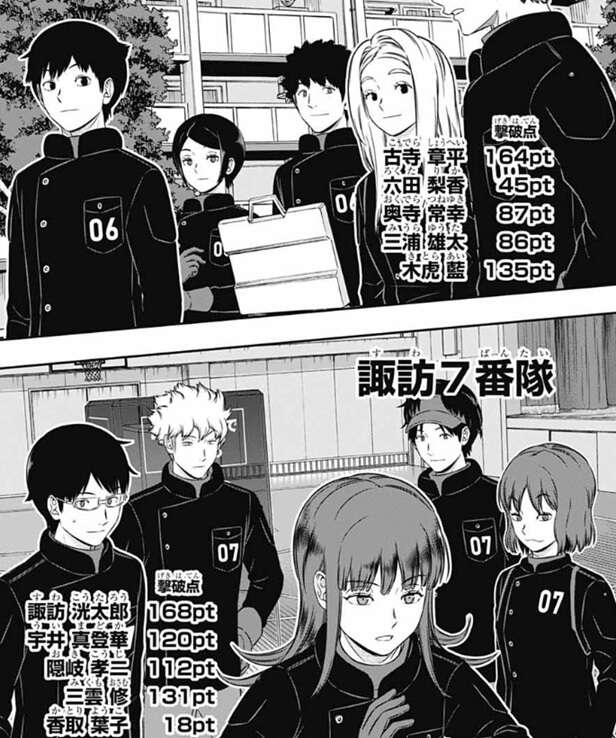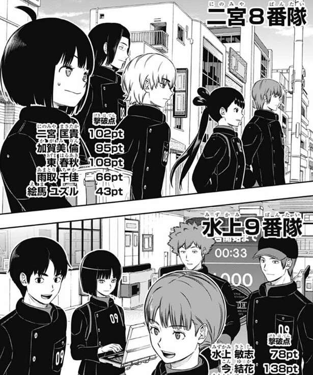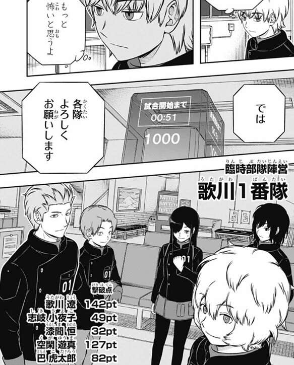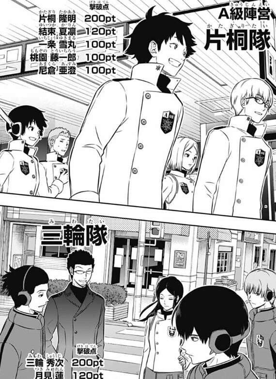 ただ、絵馬は三雲の目算が外れているとは思わないけど……、A級はたぶんもっと怖いと思う、とA級部隊相手では簡単にいかないと考えます。ここで各チームの撃破点が明らかになります。