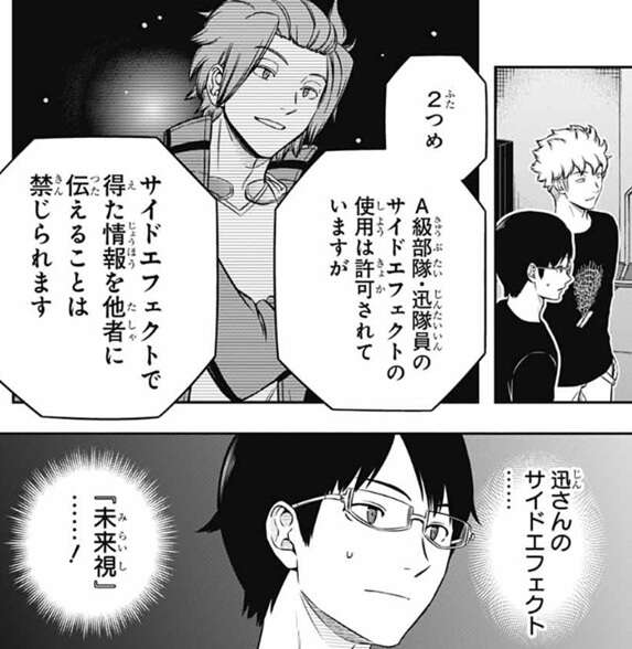 2つめはA級部隊の迅の未来視のサイドエフェクトの使用は許可されているようですが、サイドエフェクトで得た情報を他者に伝える事は禁じられている、と説明があります。迅の未来視の情報をA級部隊全体で共有されると、A級部隊が有利過ぎるのでその為の追加ルールでしょうか?