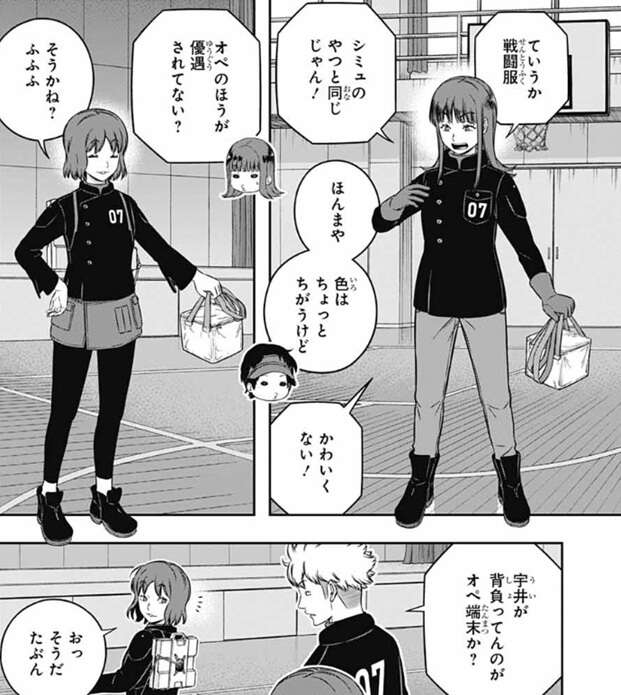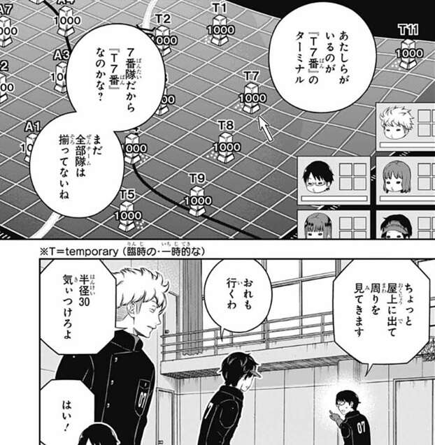 宇井が早速オペ端末を起動し、マップを確認します。諏訪隊がいるのが『T7番』のターミナルです。マップにある臨時部隊のターミナルには、『temporary(臨時の・一時的な)』のTの後に数字が付くようです。また、A級部隊のターミナルはAの後に数字が付くようです。まだ全チーム揃っていないようで、全チームが揃うまで三雲と隠岐は体育館の屋上に出て周りの情報を収集します。