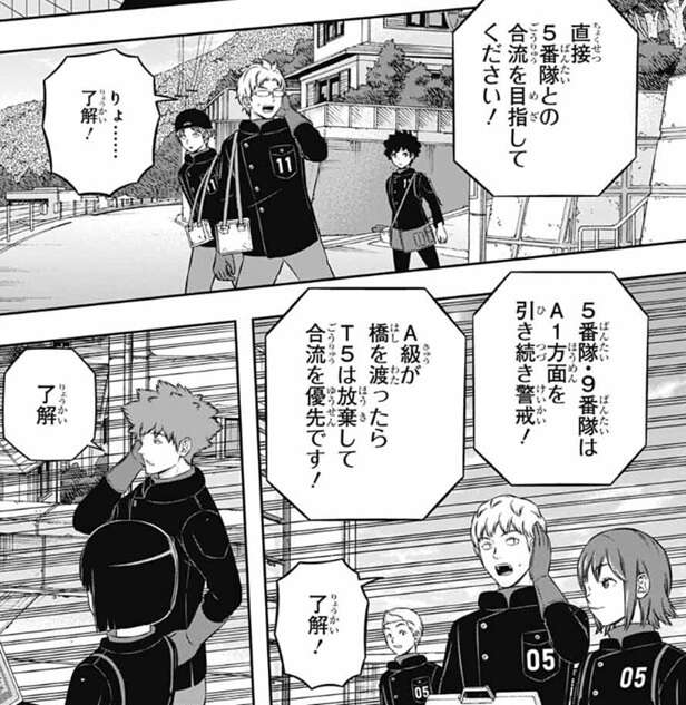 A級の数部隊が橋を越えた事をMAPで確認した来馬は、T5ターミナルを捨てて4,8番隊と合流する事を確認、4、5、8、9番隊に加えて3、7番隊も合流してA級を迎え撃つ感じっすかね、と小荒井も来馬達に確認します。すると再び生駒はいつの間にか合流、T4も捨てれば6、10番隊とも合流できるのでは?と、会話に参加します。香取も生駒と一緒に合流していて、小荒井からなんでもうここにいるんすか!?と聞かれた生駒は当然の様に、おかずを受け取りに、と答えます。一方香取は、アタシはちがうわよ、とツッコみます。