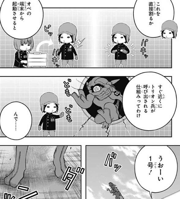 このトリオン兵のタマゴを直接割るか、オペの端末から起動させると、すぐ近くにトリオン兵が呼び出される仕組みのようで、別役はさっそく既に自分が呼び出したトリオン兵に命令を出します。