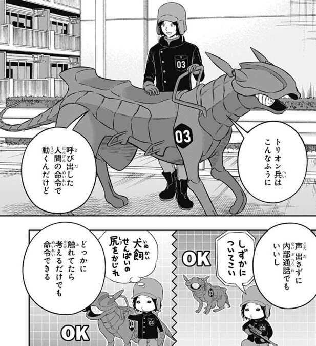 香取が、自分が呼び出したら自分の命令しか聞かないわけ?と、別役に質問すると、オペ端末で持ち主を変更する事も可能で、さらに直接触ってトリオン兵の操縦権をもらうこともできるよ、と別役が答えます。じゃあ雑に呼び出しても大丈夫ね、と香取が言った後、三雲がこのトリオン兵の性能を質問しますが、こいつは『騎乗用』のトリオン兵なんだ、と別役が答えます。