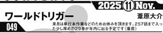 ワールドトリガー 第259話ですが、12月4日(木曜)発売予定のコミックス29巻発売に向けての単行本作業などのため休載となっています。体調不良による突然の休載、とかではありません。
