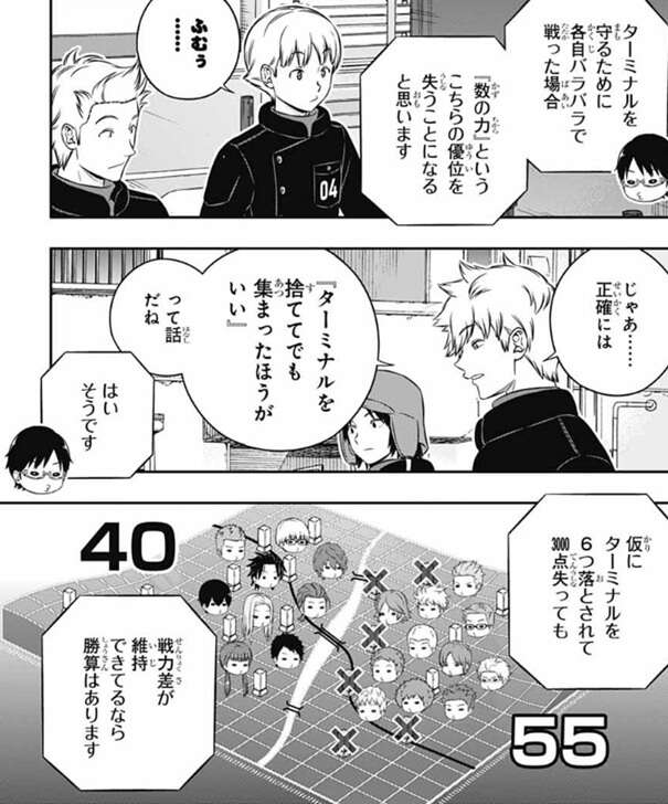A級部隊陣営より臨時部隊陣営の方が、隊員の数でもトリオン兵の数でも明確に有利なため、ターミナルを捨ててでも合流を優先し『数の力』で優位に立とうという作戦です。ただ最初はターミナルをいくつか捨てるので、点差が開いた後時間切れ狙いの作戦をされると逆にA級陣営の方が有利そうです。この作戦がA級部隊陣営に通用するか?長時間戦闘試験が開始した所で、第258話は終わっています。この続きを早く読みたいですね。