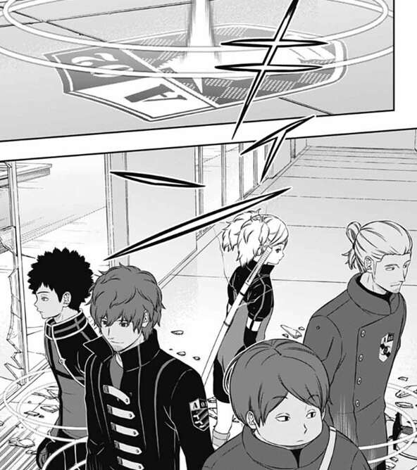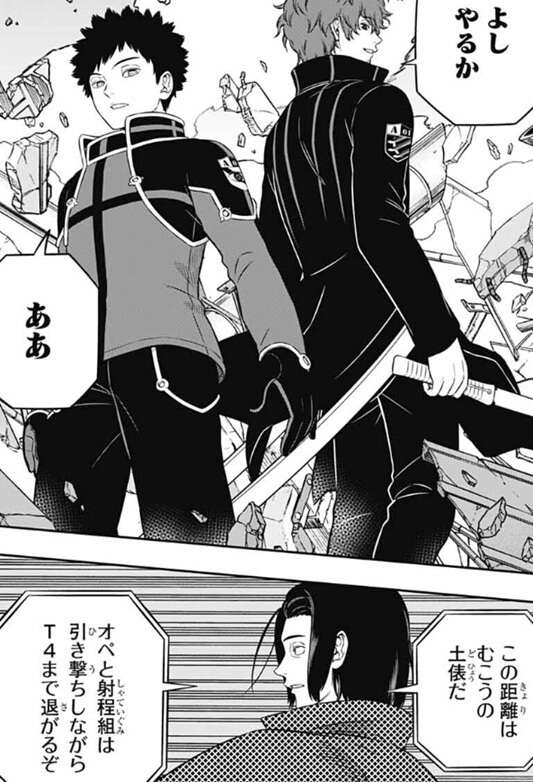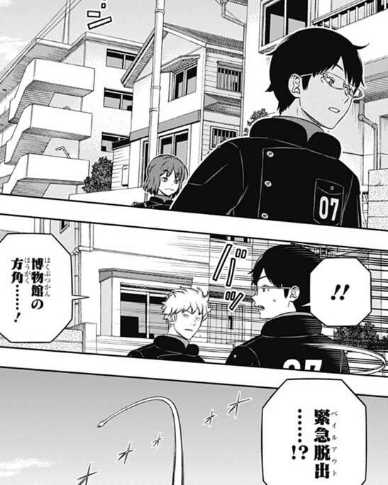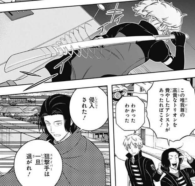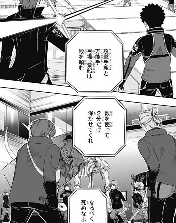 ワープが完了し、黒江も弧月を装備し戦闘に備えます。唯我はエスクードでアシストした事を自慢しますが、わかった、わかった、と出水にやんわり注意されます。一方、東は博物館に侵入されたと分かると、すぐにスナイパーに一旦下がるように指示を出します。